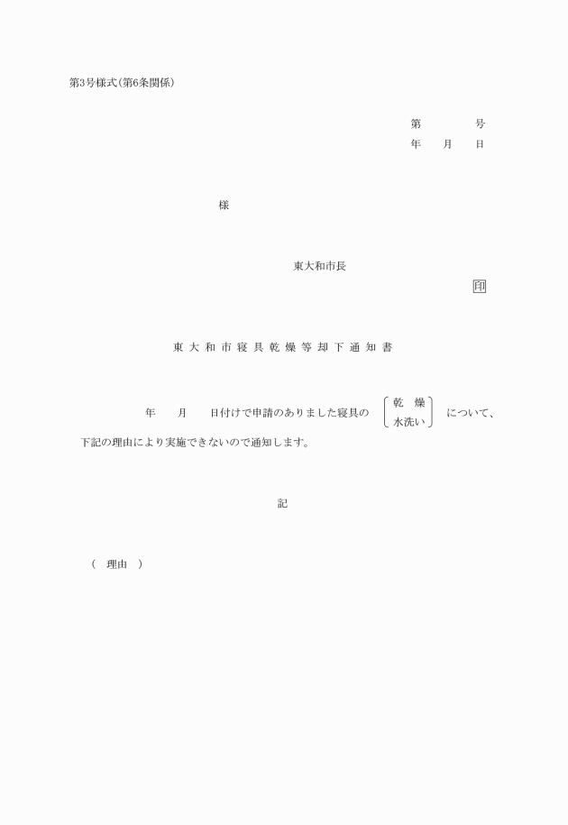 第7条 対象者が転居した場合は、東大和市寝具乾燥等対象者転居届(第4号様式)に転居の事実を証する書類を添えて、速やかに市長に提出しなければならない。
