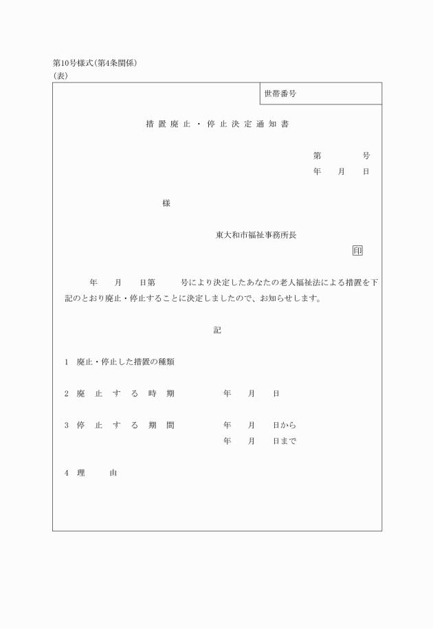 2 福祉事務所長は、措置を廃止し、又は停止することを決定したときは、措置廃止・停止決定通知書(第10号様式)により当該措置を受けている者(以下「被措置者」という。)に通知しなければならない。
