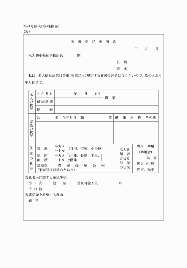 第9条 老人福祉法施行規則(昭和38年厚生省令第28号)第1条の7の規定による養護受託の申出は、養護受託申出書(第21号様式)により福祉事務所長へ申し出るものとする。