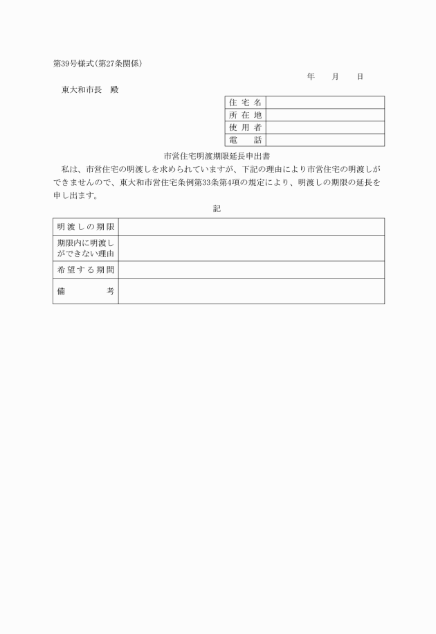 第11条 条例第12条第5項ただし書の規定による承認を得ようとする者は、市営住宅使用開始延期申請書(第11号様式)を市長に提出しなければならない。