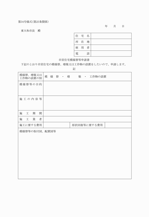 第25条 条例第29条ただし書の規定による承認を得ようとする者は、市営住宅模様替等申請書(第34号様式)を市長に提出しなければならない。