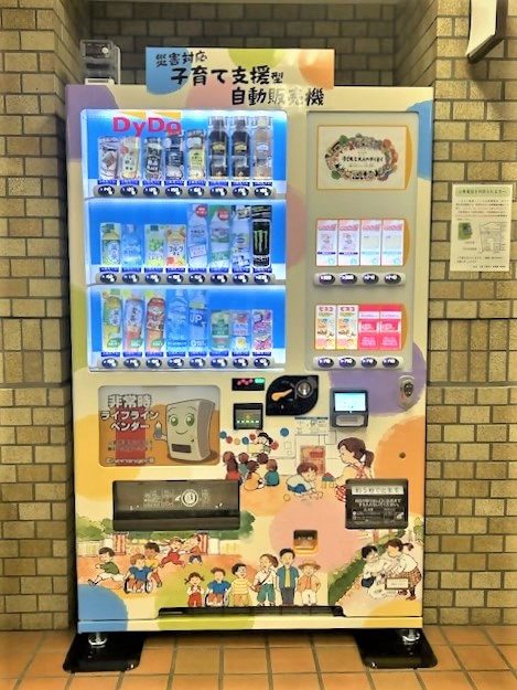 包括的連携に関する協定の連携事項、「1.子ども・子育てに関すること」に関し、安心して子育てができる環境づくりに向けた連携の一環として、子育て世代の方々が紙おむつの心配をすることなく外出できるよう、ベビー用紙おむつと飲料が購入できる自動販売機を設置しました。